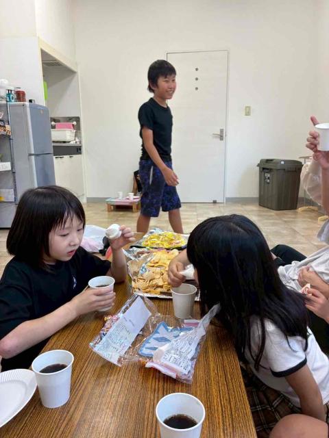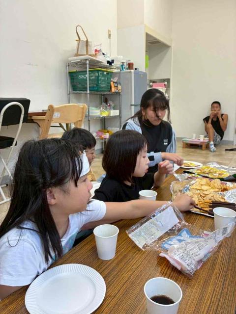 お引っ越し作業を終えた後は、みんなでテーブルを囲んでお菓子タイム。新しい環境に少し緊張していた子も、お菓子を食べながら友達やスタッフと会話するうちに、自然と安心した表情へと変わっていきました。食べ終わる頃には、教室全体があたたかな笑顔でいっぱいになっていました。